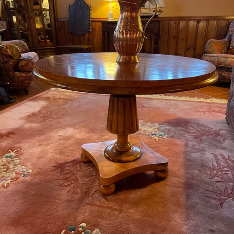 Spisestue i Art Deco stil. Åpen for fornuftig bud. 5 stoler med skinn trekk på sete. Spisestuen er fra tidlig på 1900 tallet. 2 ileggsplater i bordet. 2 skjenker (1 er ikke med på bilder)