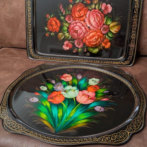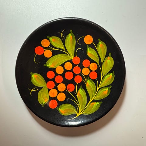 Sortlakkert trefat dekorert med påfugl og blomster. Tradisjonell dekorativ malerkunst fra landsbyen Petrykivka i Dnipropetrovsk oblast, Ukraina. Petrykivka-stilen ble oppført på UNESCOs liste over immateriell kulturarv for Ukraina i 2013.