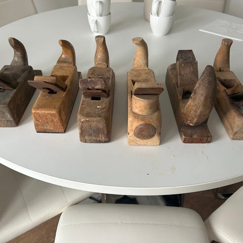 Fem gamle tretvinger til pynt. Tre forskjellige størrelser. En av de to største tvingene har en sprekk der skruen sitter.