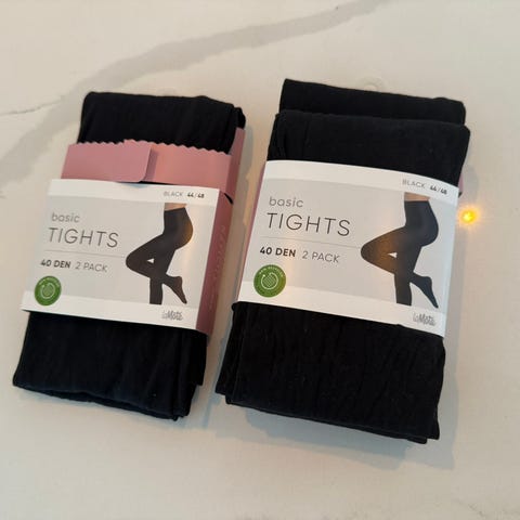 Tre nye, uåpnede «glamourus tights» fra Lindex, strl L. Tynne sorte pene strømpebukser med mønster.