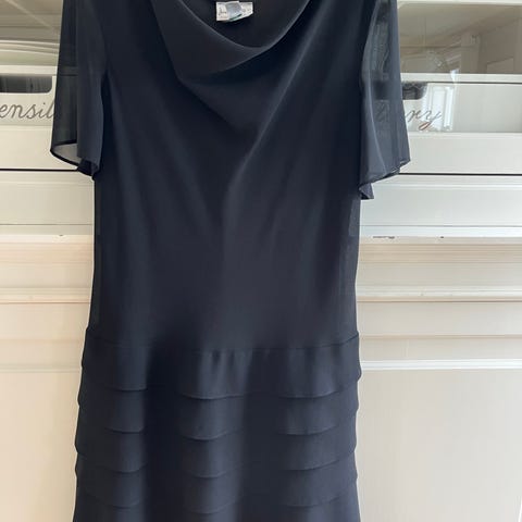 Pen kjole fra Joseph Ribkoff, strl 44. Sort tykt, mykt stoff som faller fint. Med sølv-pynt og glidelåslukking bak. Cirka til kneet. Figurnær, men ikke ettersittende modell. Pent og lite brukt, uten anmerkninger.