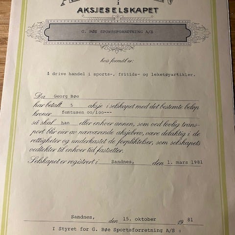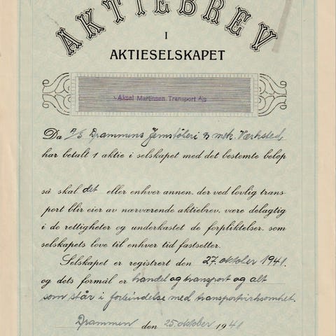 Pålydende kr. 4000,-. Datert 10. September 1981. Huset Vårt var det første kjøpesenteret som ble åpnet i Sandnes. Aksjebrevet består av 8 aksjer a kr. 500,- og er nummeret 1-8. Særdeles pent eksemplar, se bilder. Kom gjerne med et seriøst prisforslag.