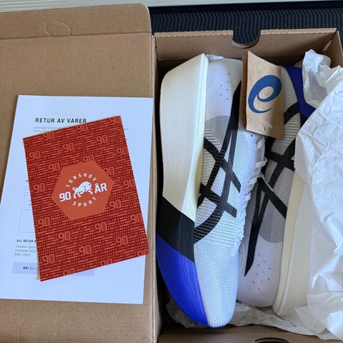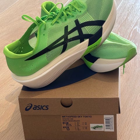 Asics Metaspeed Sky Tokyo str 46 2/3 selges da skosamlingen skal tynnes ut. Brukt på ett halv-marathon + oppvarming.