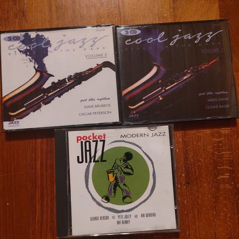 Selger 7 stk jazz-CD'er av den gamle jazzen fra 40-60 tallet. Alle titlene vises på bildet. På Miles Davis-albumet er det siste sporet på plata ødelagt pga ei ripe på disken, så den selges for 10 kr. De øvrige koster 15 kr pr stk eller 80 kr for alle samlet. Porto etter Postens takster tilkommer, eller de kan hentes i Redalen utenfor Gjøvik. Benytter ikke Fiks Ferdig.