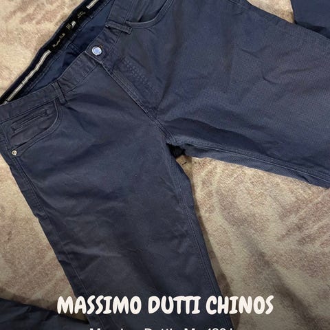 Massimo Dutti Chinos for menn i størrelse M. Buksene kommer i svart, blå og brun og har en klassisk chinos-stil.