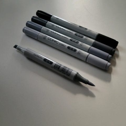 Copic Marker Sett med ulike farger inkludert nyanser av rødt, gult, grønt, blått, brunt og hudtoner. Markørene er designet for bruk i tegning og illustrasjon, og tilbyr presis fargegjengivelse og blandingsmuligheter.. de koster 99 kroner i de fleste hobby butikker.. deg er 97 farget og de er lite brukt. Dette er jo en investering for Copics er ikke en vanlig tusj. Du kan bytte tuppene om de blir slitt og du kan kjøpe refil om du skulle bli tomme. Det er 97 tusjer og jeg vet ikke hvor gamle de er da jeg har kjøpt litt og litt.jeg har betalt ca 9600kr for alle sammen og ønsker bud på over 2000kr