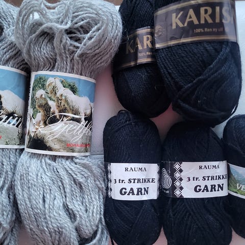 Garn til sokk/ragg/lest. Fire uåpnet, alle fra Trysil garn. En noe brukt også fra Trysil. To andre eldre typer som virker å ha samme kvalitet. Samlet 70kr