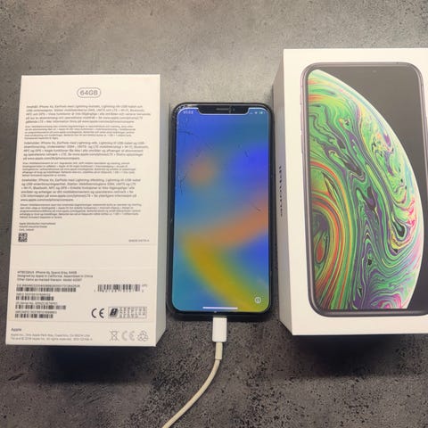 Selger en iPhone XS Space Gray 256GB. Synlig skade oppe i høyre hjørnet med en sprekk som går ned mot venstre.
