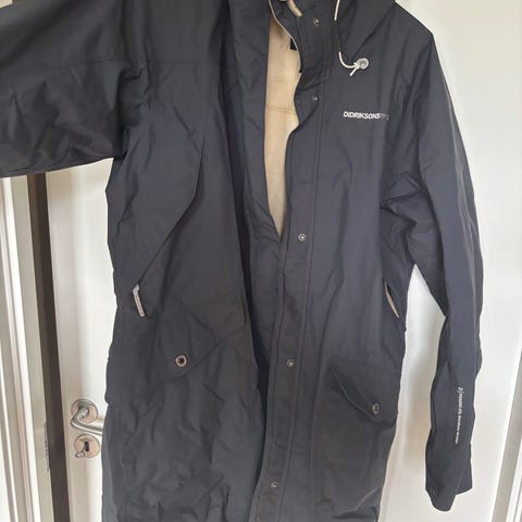 Didriksons regnjakke i størrelse XS for kvinner, i marineblå farge. Jakken er laget for utendørs bruk og har funksjoner som hette, frontlommer med klaff og justerbar midje. Materialet er vanntett og egnet for regnvær.