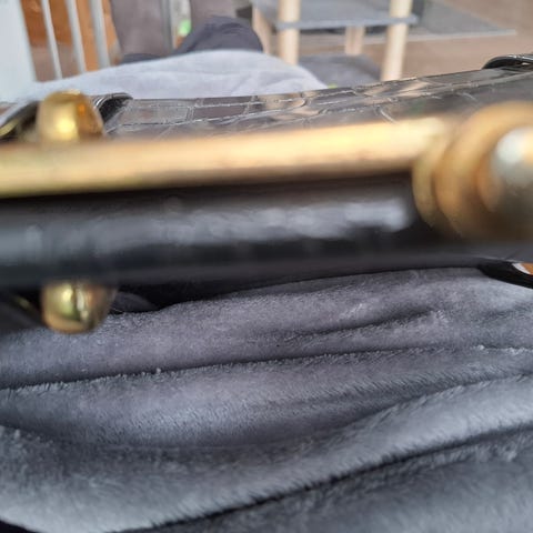 Denne er i beige, to litt lange håndtaker og flere lommer inni vesken. Noe bruksmerker under vesken, men ellers veldig fin. Er nok ikke mye brukt.