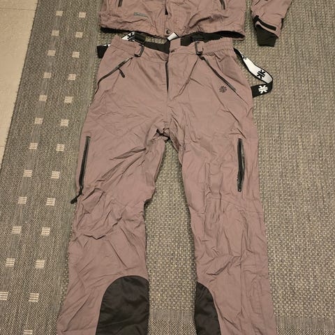 Kan strammes i livet, ved beina og jakken kan strammes nederst, armer, ved hette og i livet.