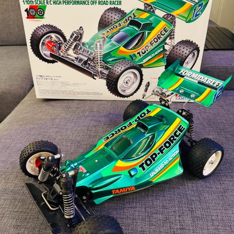 Vintage Tamiya Mighty Bull radiostyrt bil i skala 1:10 med rød karosseri. Modellen har store terrengdekk og er designet for off-road kjøring. Egnet for hobbybruk og samling. Denne er brukt kun noen få ganger, men kommer med litt støv og skitt. Ikke testet på noen år, så selges slik og som den står.