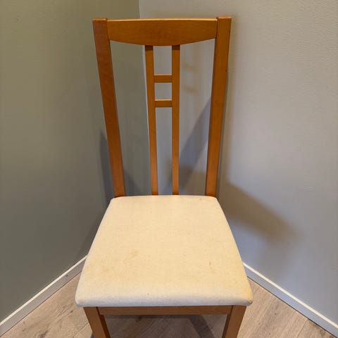 4 spisestoler. Ukjent merke trestol i hvit farge. Stolen har et enkelt design med en rett ryggstøtte og fire ben. Egnet for bruk som spisestol eller ekstra sitteplass. Kan leverses i Bergensområdet etter avtale. Selges samlet kr 300.