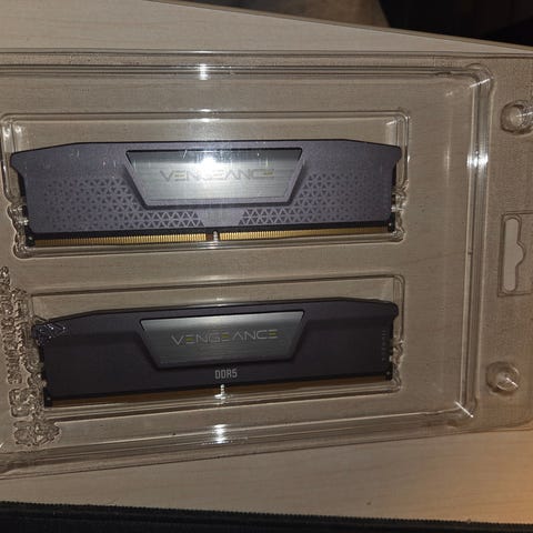 Corsair Vengeance DDR5 RAM med totalt 64GB kapasitet fordelt på to moduler à 32GB. Klokkehastighet på 5200MT/s, med timings 40-40-40-77. Versjon 3.43.01. Laget i Taiwan.