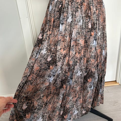 Vidt og lett skjørt. Finner ingen lapper i det, så kanskje er det hjemmesydd. Det er strikk i livet, så kan nok passe flere størrelser. Kan tenke meg en L også. Strikken som er der nå er nokså vid, så den kan strammes inn etter eget ønske om du spretter opp sømmen. Har tatt mål flatt, men strikken kan dras mye mer ut da den er veldig elastisk.