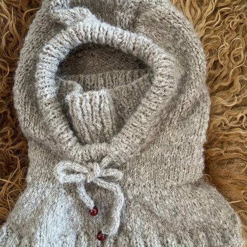 Begge i mykt stoff med leopardmønster. Luen er med kant (ca. 10 cm) av brun fuskepels med knytebånd (ca. 20 cm) for knyting under haken eller bak og gummistrikk bak. Skjerfet er ca. 120 cm x 10 cm.