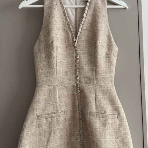 Fra Danmark. Bildene er tatt på en manequin som er M-L, så har god stretch, men dukken ble litt for stor. Knyting i livet, som kan knytes både foran eller bak i ryggen. Nydelig passform, med små puffer på skuldrene. Virker nesten ubrukt. Kjøpt den i en vintagebutikk for noen år siden. Vasket parfymefritt. Materialet tror jeg er polyester eller kan også kanskje være viskose. Finner ingen lapp.
