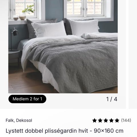 2 stk Falk lystette doble plisségardiner i størrelsen 90x160 kjøpt på Kid selges. De er kun hengt opp og tatt ned igjen da jeg oppdaget at jeg hadde kjøpt feile gardiner.