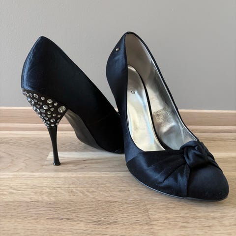Lekre sorte Chicas hæler med strass, str 39. Brukt 2-3 ganger. Hæl: ca 9,5 cm. Hentes Oslo eller sendes mot porto.