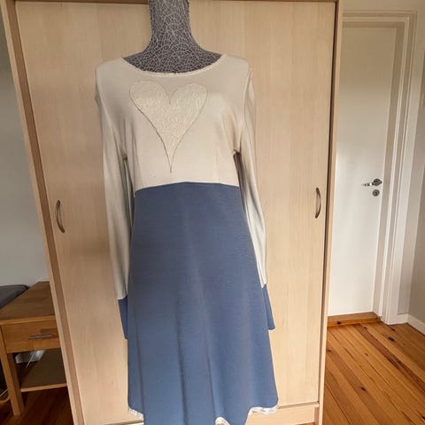 Unik kjole i brun fast ullboucle med blå strikkede detaljer, strl M/L - jeg vil si at den er ca strl 42. Laget i ett eksemplar av 2jinter på Nes. Ca kne-lengde, figurnær. Pent og lite brukt, så den fremstår nærmest som ny. Nye koster kjolene ca kr 3000.