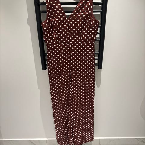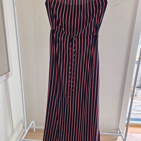 Farger: mørkeblå kjole med små mønstre og rødt forkle med hvite detaljer