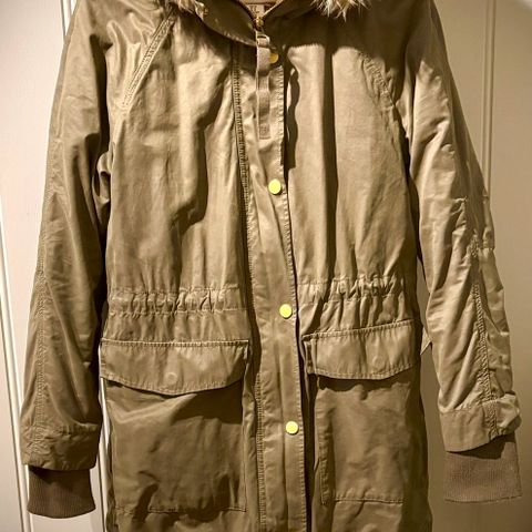 Jakken har en polstret, vattert design med hette og knappelukking foran. Materialet er mykt og gir isolasjon, egnet for utendørs bruk i kaldt vær.