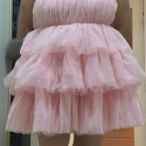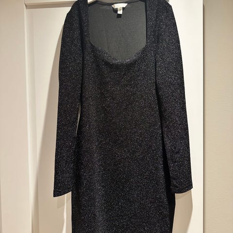 Fin, tettsittende glitter kjole. Lengde fra stroppen og ned 88 cm.
