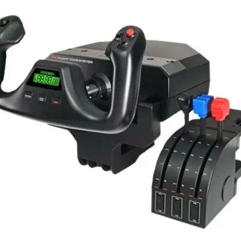 Logitech Flight Yoke System med flystick og pedaler. Inkluderer yoke, tre pedaler og tilhørende kabler. Yoken har flere knapper og brytere, og pedaler med skråstilte plattformer. Produktet er laget av plast og metall, og er designet for flysimulatorbruk. Kr 800 eller bud