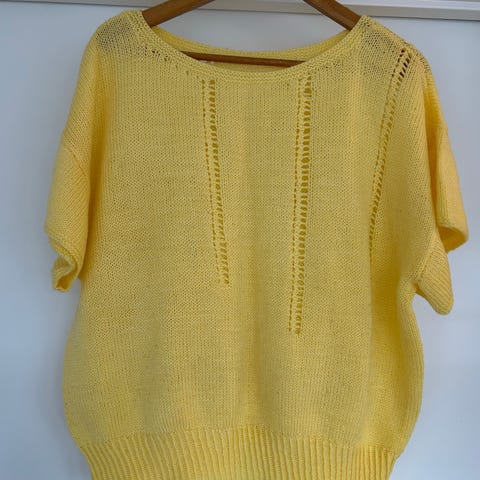 En hjemmestrikket, luftig genser i bomullgarn. Den er i en slags lys grønn farge, med litt helling mot turkis. Ikke så lett å få fram på bildet, da den varierer i ulikt lys. Størrelsen vil jeg si er en XL, og en vid, litt oversized modell. Se mål.