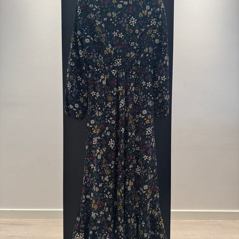 Søt kjole fra Zara! Mørk blå (nesten svart) bunnfarge, blomsterprint i turkis. Kjolen har lange ermer, og er laget av et lett, plissért materiale. Strikk i livet, veldig behagelig på! Normal str. M.
