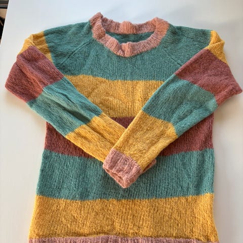 Lett genser strikket med ullgarn. 3/4 lengde på armer. Striper.
