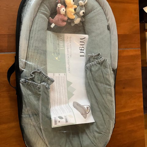 Yngri babynest med mykt stoff i grått, inkludert lekebue med tre myke kosedyr og avtakbart myggnett. Babynestet gir en komfortabel og trygg plass for babyen å hvile eller leke, med polstrede kanter for støtte. Passer for spedbarn. Leken er også avtagbar ved en klipps i siden.