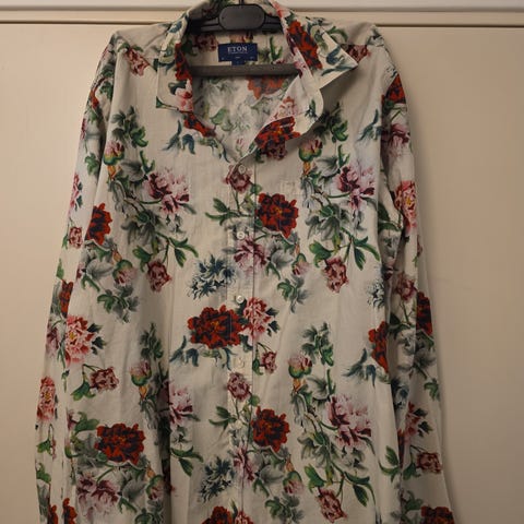 Mønstret skjorte fra Dressmann i XL og er laget av en linblanding.