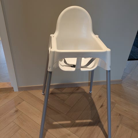 IKEA høy barnestol i hvit plast med grå metallben. Metallben kan tas av. Godt brukt. Den ene hempen for å feste seler er knekt.