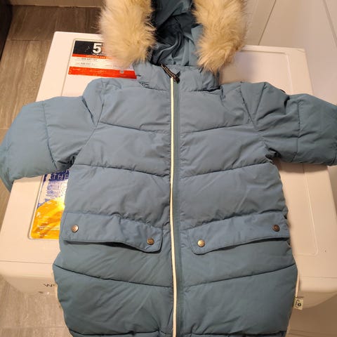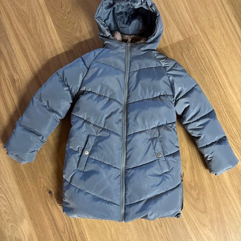 KappAhl barnejakke i størrelse 116 farge blå. Jakken har avtagbar hette, flere lommer med klaff og knapp, og er laget for å gi varme og beskyttelse i kaldt vær. Aldri brukt da den ble glemt.