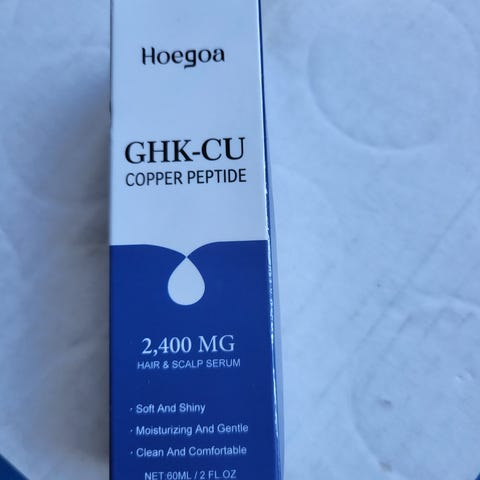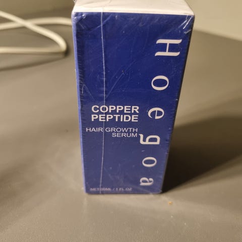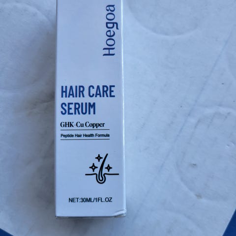 Hoegoa Copper Peptide Hair Growth Serum med en volum på 10 ml. Produktet inneholder kobberpeptid og er formulert for hårvekst. Emballasjen er blå med hvit tekst.