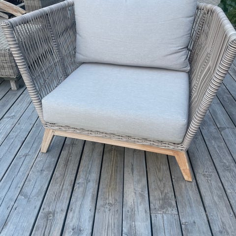 Selger en kjempefin flettet/rotting loungestol for utebruk. Lys grå/muldvarp. Tidløst design. Enkel vedlikehold. Putene har avtakbart trekk. Slitesterkt stoff, vannrepellerende, kan impregneres. Stolen og putene er gode som nye. Har stått i innebod i to sesonger. Veldig god å slappe av i.