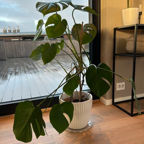 Stooor monstera, med to stammer (altså to planter i en dunk), vokser seg ut av stua vår, har dessverre ikke plass til den lenger. Jeg er selv 168 og den når meg ca midt i panna, så den er høy. 1000,- uten sinkbalja den står i. Hentes på Fevik.