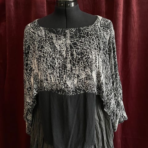 Unik topp i 100% viskose fra Avalon Design på Røros. Svart bunn med blått mønster og dekorative knapper. Trekvart ermer og et lengre stykke foran og bak. Passer ca str small.