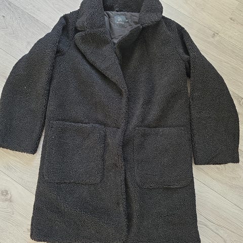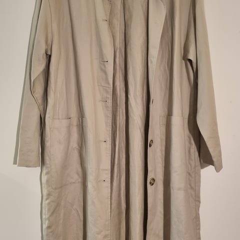 Smal modell, innsvinget, str small/medium. To lommer og toveis glidelås. Lengde 95 cm.