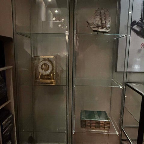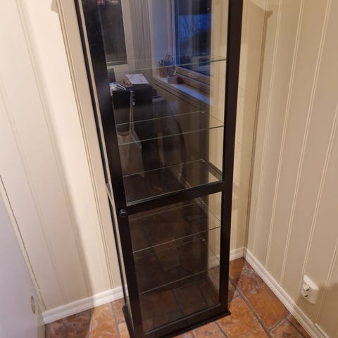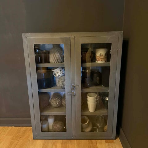 Flott grått skap, i metall, glasshyller, selges rimelig!