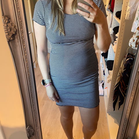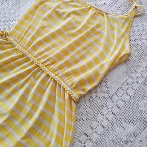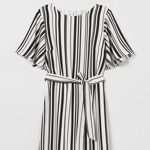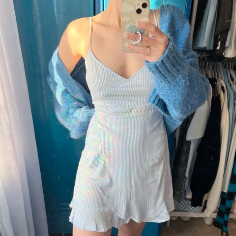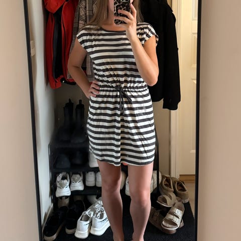 Stripete kjole i elastisk stoff i marineblå og hvite striper. Kjøpt på Zara for lenge siden.