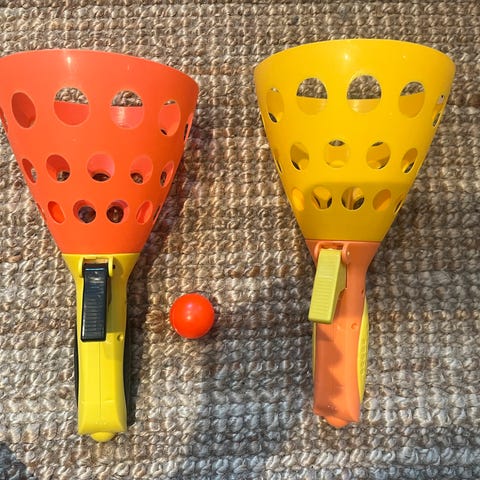 Ukjent Merke Kaste- og Fangspill Sett bestående av to plater i blått og rødt med håndtak på baksiden, samt en liten myk ball i matchende farger. Ringene har en diameter på cirka 20 cm. Materialet er av stoff og plast. Egnet for utendørs lek og trening av hånd-øye koordinasjon. 25 kr for alt, sender også som brevpost. Kom gjerne med bud.