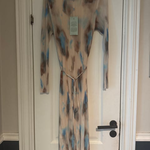 Marineblå kjole med hvite prikker fra Minus str 42. 3/4 lange armer. Behagelig 100% viskose og foret i kjolen er i 100% bomull. Rett modell, med snøring. Sidelommer i kjolen . Brystvidde 100 cm rundt. Lengde på kjolen 105 cm.Armlengde 50 cm. En fin og klassisk kjole i behagelig stoff, helforet. Kun bruk et par ganger.