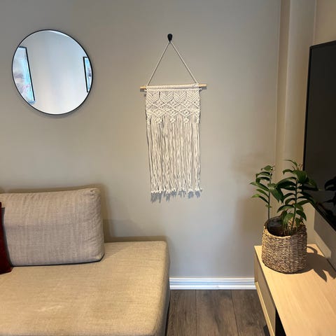 Håndlaget veggteppe i makramé m/treperler