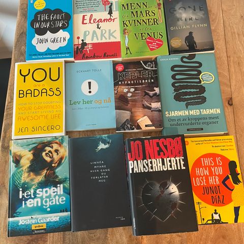 Blandet samling av bøker oppbevart i en banankasse. Inneholder ulike titler og utgaver med varierende størrelse, farger og innbindinger. Passer for samlere eller lesere som ønsker å utforske et variert utvalg av bøker, eller perfekt til salg på ett loppemarked.