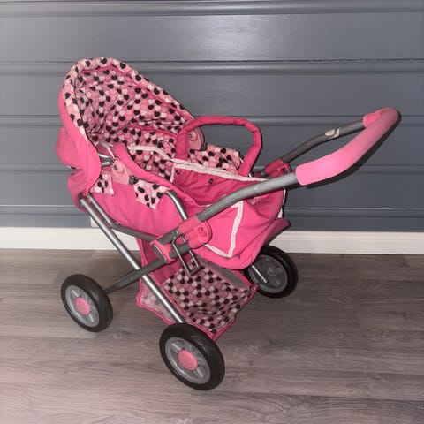Fint brukt dukkevogn som du kan ta ut vognposen ,liten veske og hylle under vogna.Det går også ann å endre på håndtaket