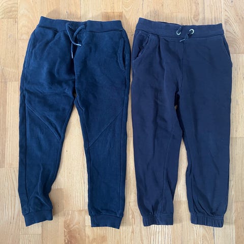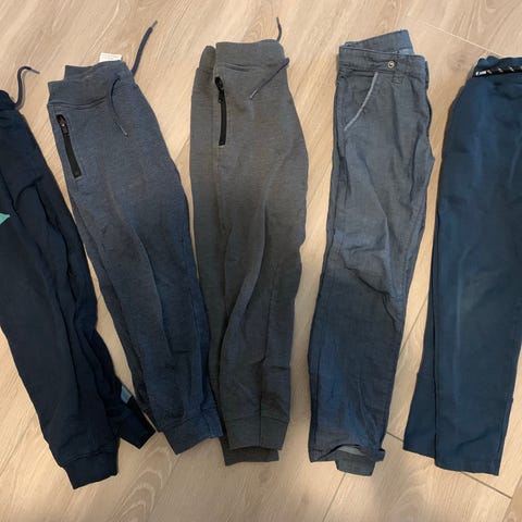 Tre joggebukser, grå str. 104 (men passet lenge), og de to andre i 110. Noen anmerkninger på to av de som avbildet, men supert til barnehagebruk.