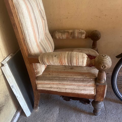 Denne stolen har vært i familien i over 100 år, men har dessverre gått litt i stykker. Reparasjon kan enkelt gjøres ved å sette inn nye skruer for å feste tverrplaten i ryggen, samt to skruer og lim for å fikse benet/ryggen. Setet har god fjæring, og er trukket opp ganske nylig.
