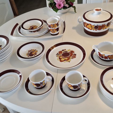 Pompeii keramikk fra Figgjo. Alle delene er ildfaste og merket handcraft/dishwasherproof. Serviset er vintage, retro fra70-tallet. Det har hatt en eier, er nesten ikke brukt og meget pent.